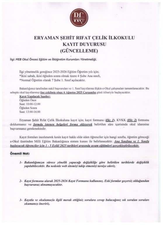2025-2026 Eğitim Öğretim Yılı itibari ile Okul Öncesi ve İlkokul...